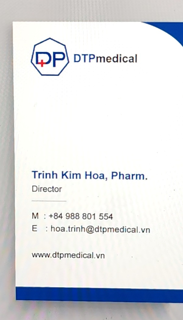 | 3 | Họ tên: : Chức vụ: Chức vụ: Director Công ty: Công ty Email: Ehoa.trinh@dtpmedical.vn Số điện thoại: +84988801554 Website: www.dtpmedical.vn Mã số thuế: Địa chỉ: | 2025-12-27 20:20:28 | Tiên Test Kanetsu | ||||